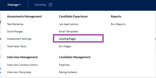 1. Click Landing Pages in the dropdown menu under Manage
