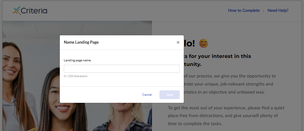 You can customize your candidates’ testing experience by creating a branded landing page that appears when they open the testing link. This page helps set the tone for a seamless and engaging experience, and supports the use of our advanced features such as proctoring and automatically scored video interviews.