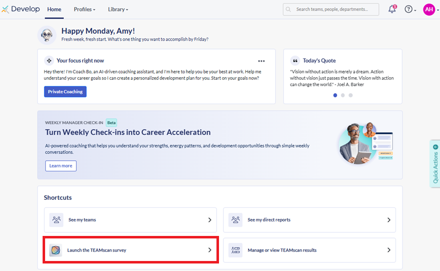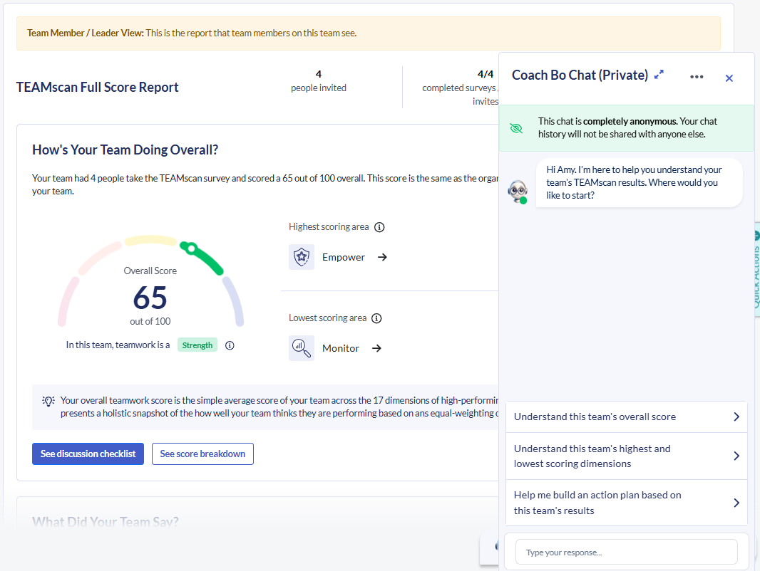 Use this guide to run a practical, high-impact team development session in Develop. Choose your session type (TEAMscan results review or Team Personality discussion), use Coach Bo to prepare, and guide your team through a structured conversation that ends with one clear experiment to try over the next few weeks.