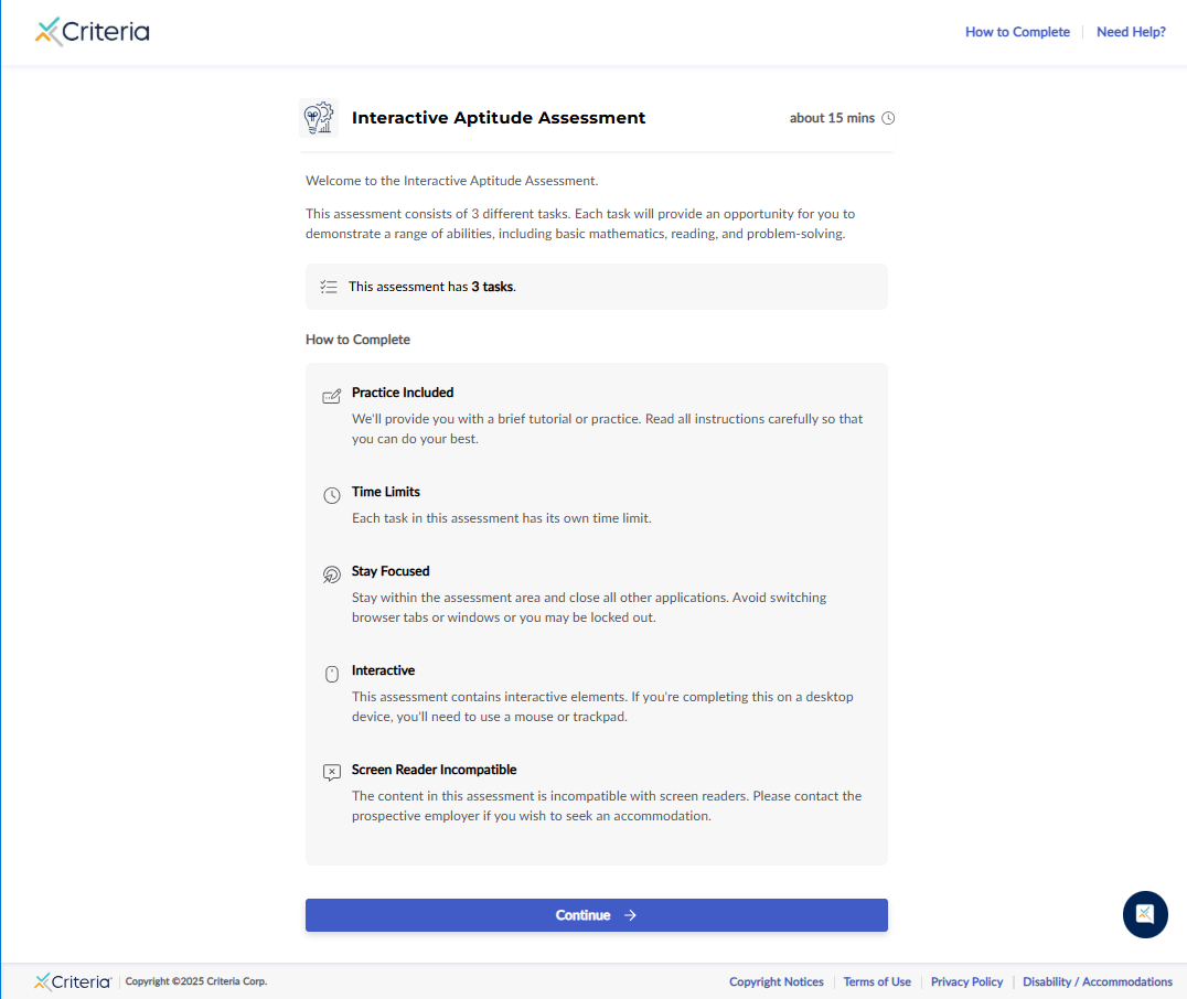 When your candidates click on a link to fill out an application form, or complete an assessment or video interview, they will be directed to the Criteria candidate center.