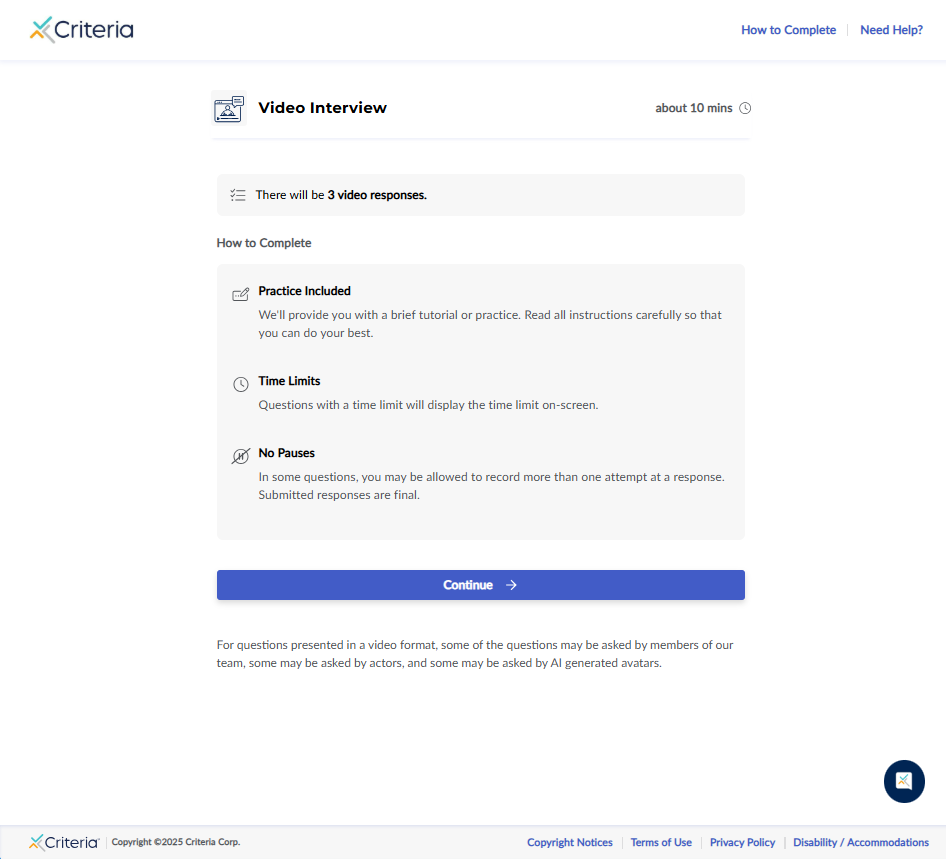 A practice question will also be offered to the candidate if they need to provide video responses, before they begin the interview questions. While candidates can skip this step if they wish, we recommend completing the practice question, for several reasons.