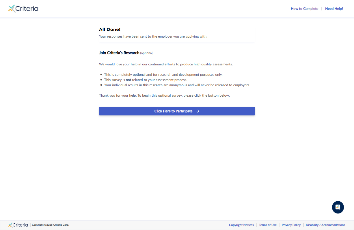 If you are using the system default exit page, your candidates may be invited to participate in Criteria's research or provide feedback on their experience. This is completely optional and candidates are advised that it is not related to their application with you. Any data collected is anonymous and cannot be linked to any individual.