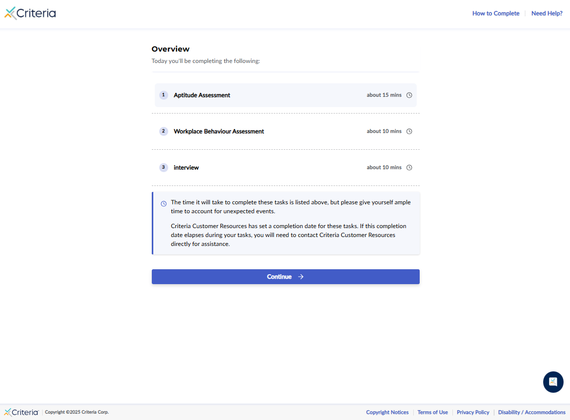 Candidates will then be redirected to the Overview page to start the first assessment.