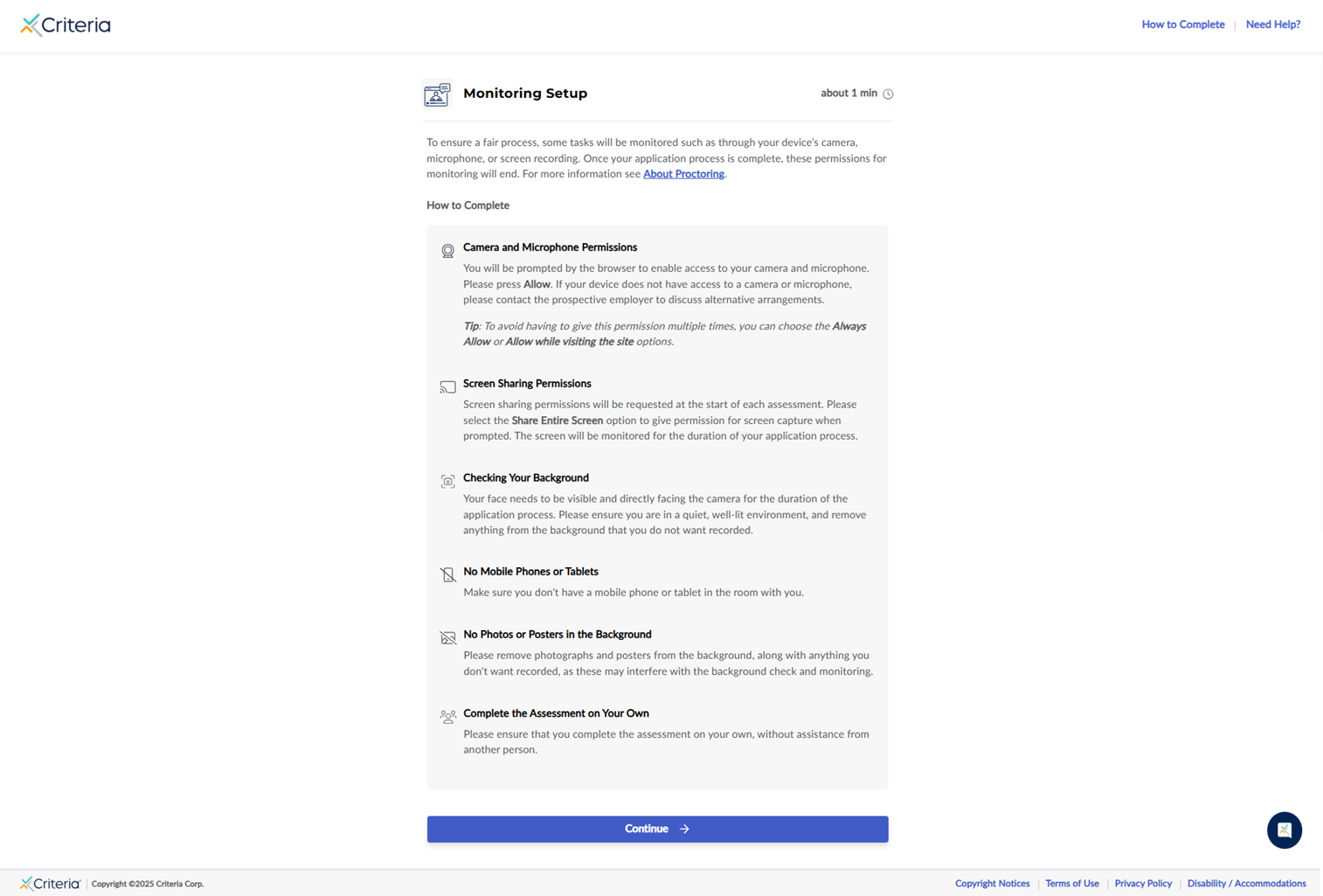 If you have included Proctoring in the assessment invitation, after the Overview page, candidates will be presented with the first Monitoring Setup page. This page contains important information regarding the monitoring methods that will be used during their testing session.