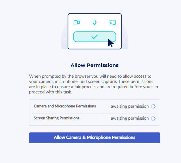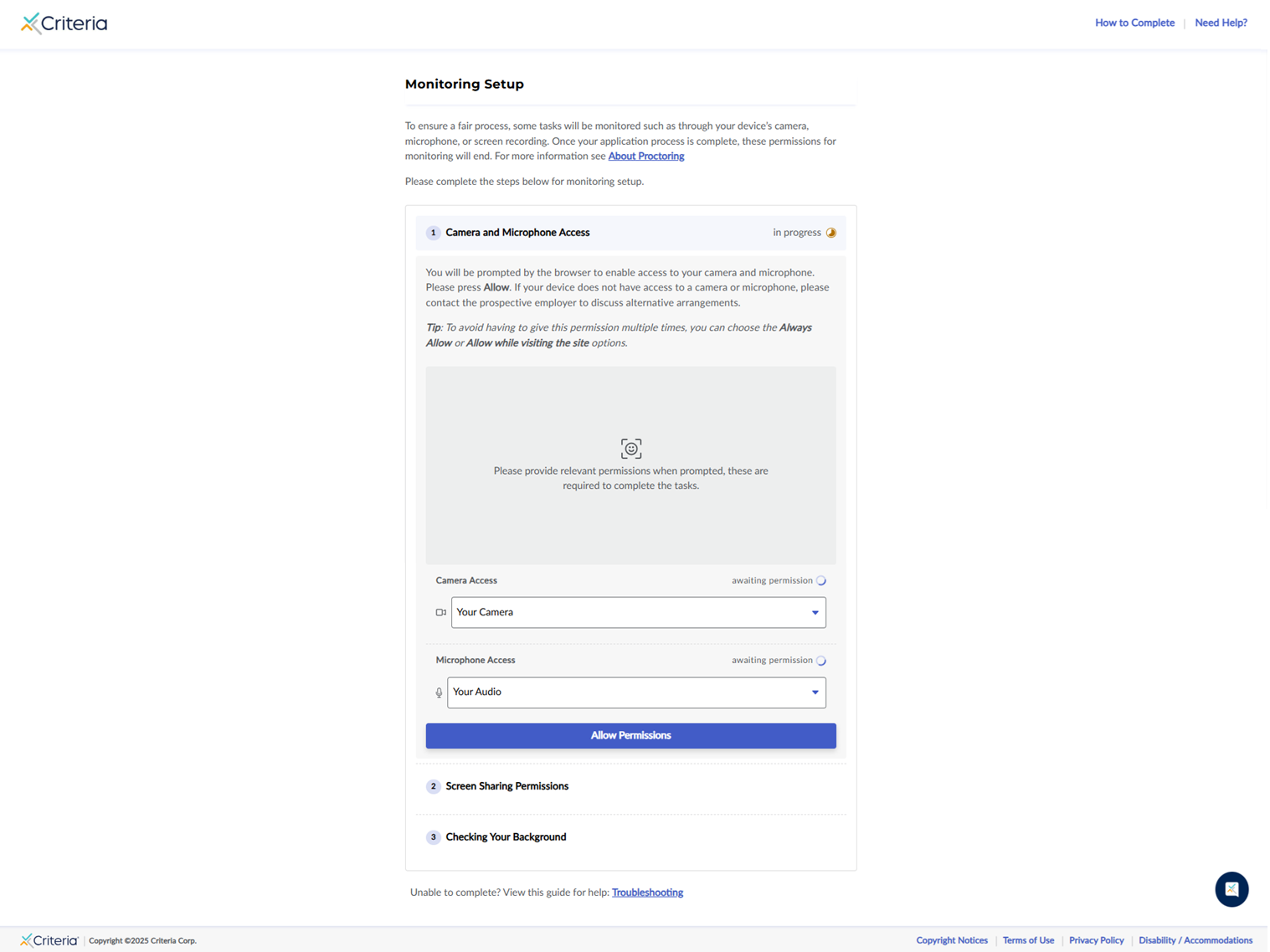 - Monitoring Setup: If you have set the assessments to be completed under proctored conditions, the Monitoring Setup will occur before any assessments are started.