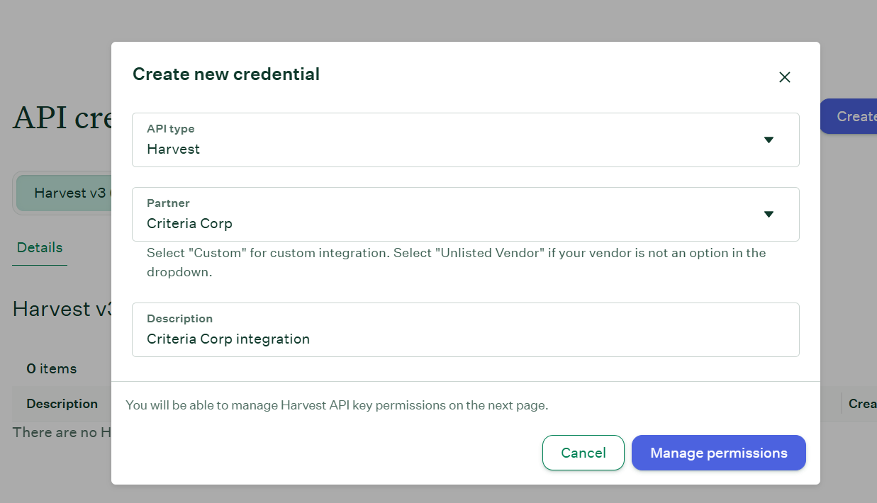 Your Harvest API key for the Greenhouse/Criteria integration is now created and configured. Provide the API Key to Criteria.
