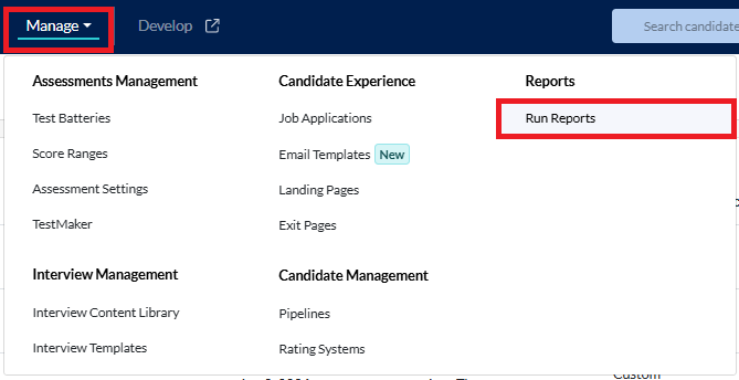 1. To generate this report, go to Manage in the top menu and select Run Reports from the dropdown list.