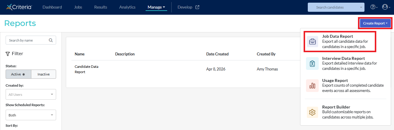 2. Click Create Report in the top right corner, then select Job Data Report from the list.