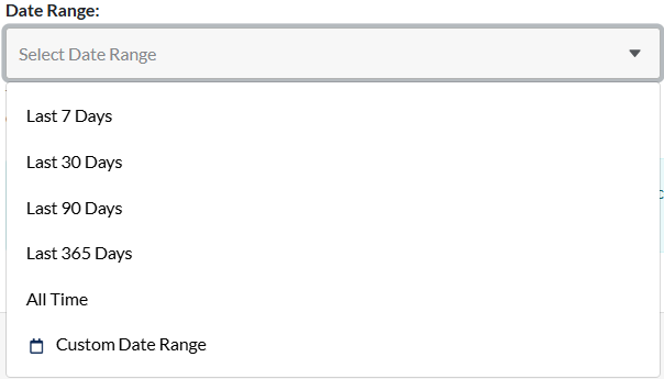 1. Set the date range for the report. The options are: Last 7 Days, Last 30 Days, Last 90 Days, Last 365 Days, All Time, or select Custom Date Range and enter the From and To dates.